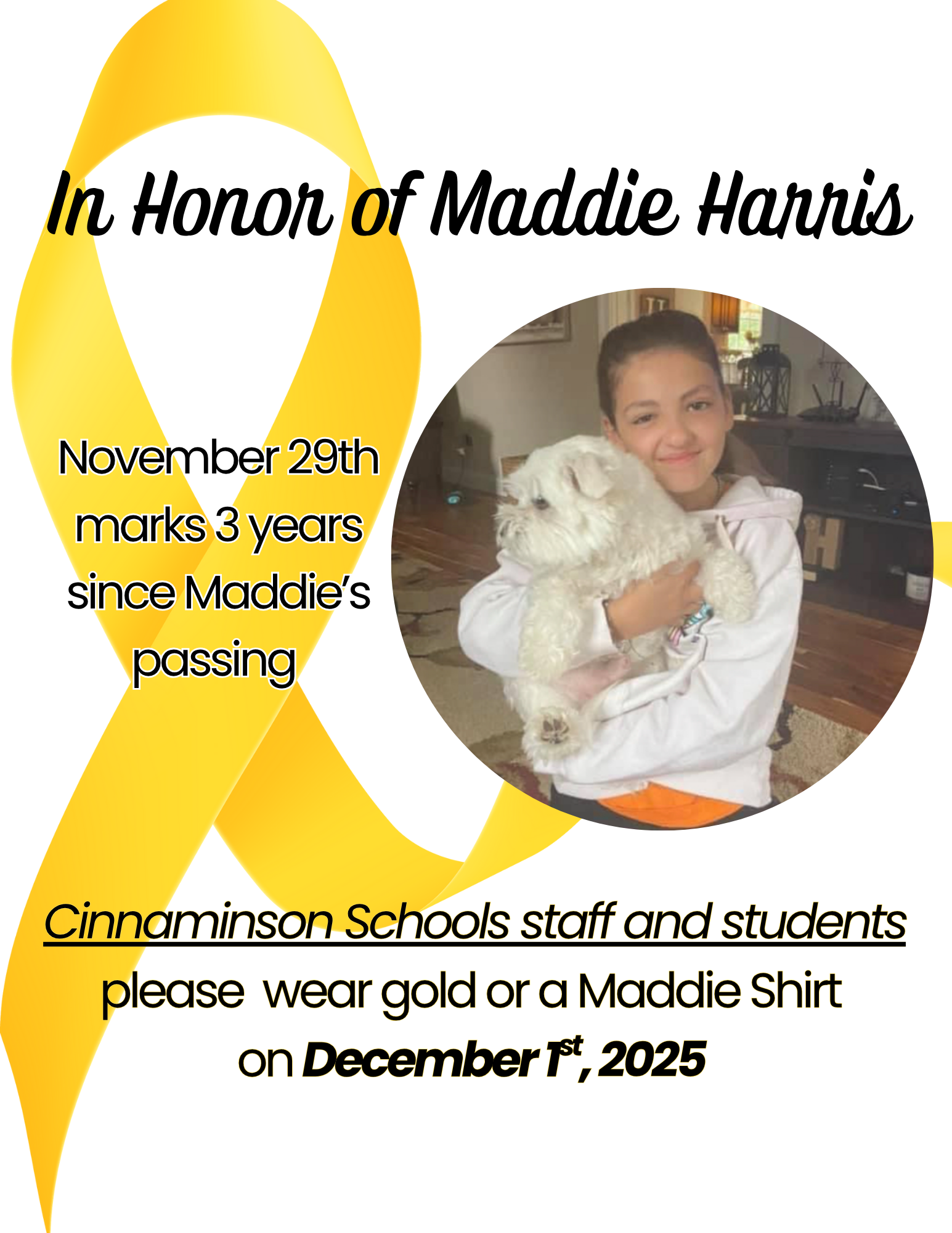 On December 1st, our district will come together to remember Maddie Harris. We ask all students and staff to wear yellow, gold, or a Maddie shirt to honor her memory and the light she brought to ou...